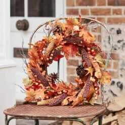 Couronne Automnale Pré-éclairée De 50 Cm à Baies Et Pommes De Pin