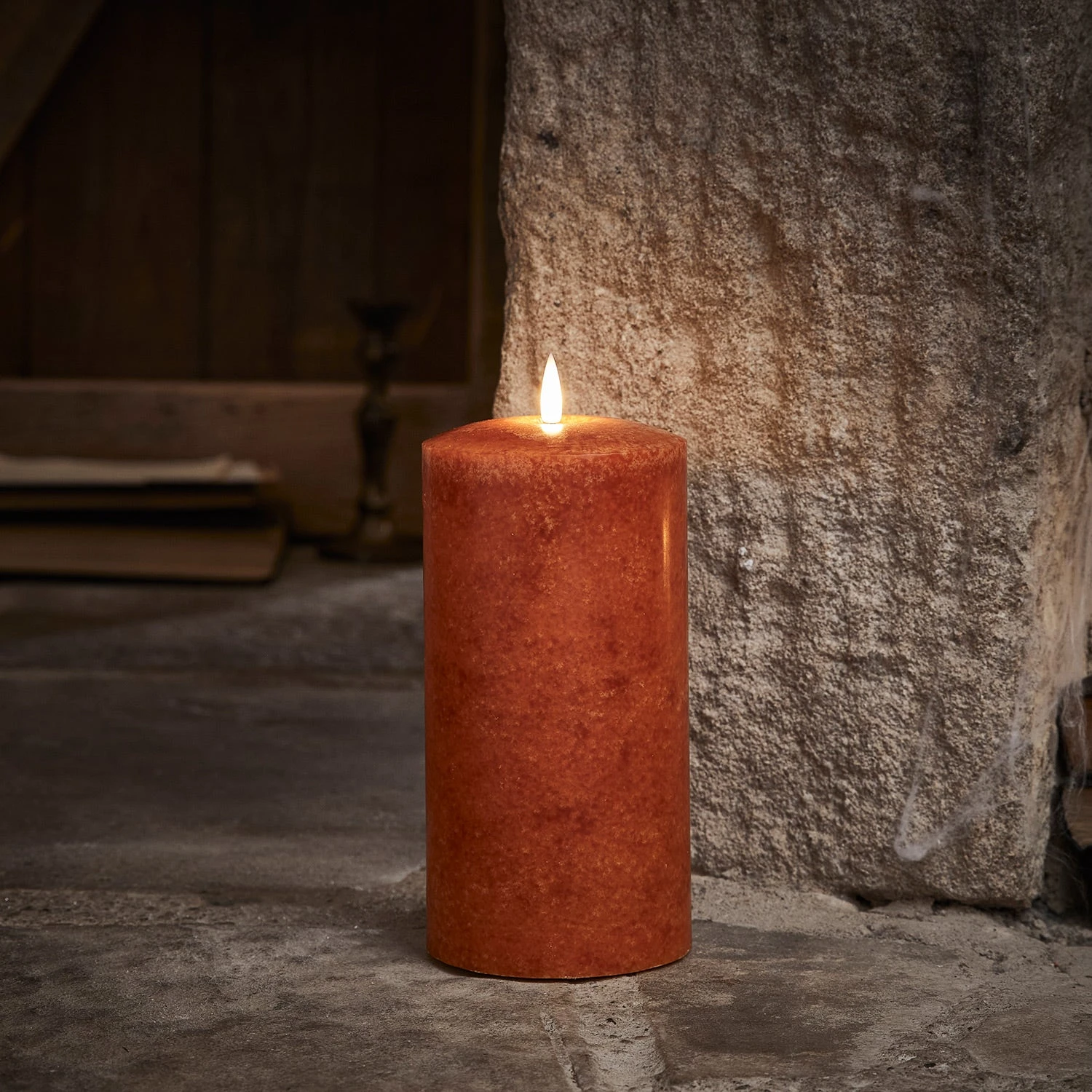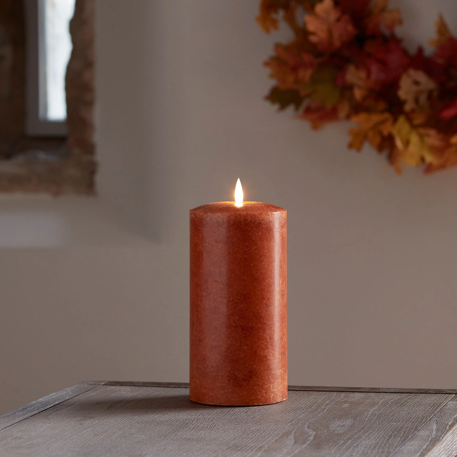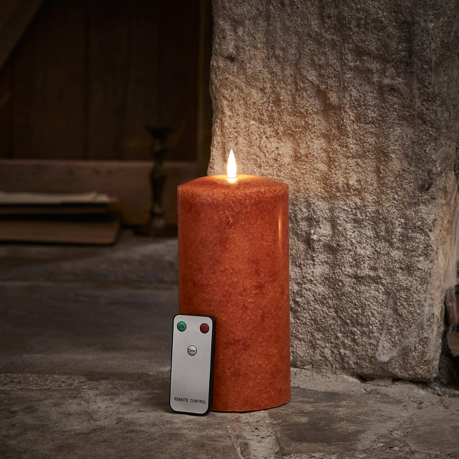 Faites de vos soirées d’automne un moment de pur bonheur grâce à notre bougie cierge TruGlow® de taille moyenne. D’une hauteur de 20 cm et d’une finition orange mouchetée, elle incarne parfaitement les couleurs chatoyantes de la saison et invitera l’automne dans votre intérieur. || Faite de cire véritable, cette bougie à l’aspect « juste allumée » est une alternative très sûre aux vraies bougies. La flamme LED blanc chaud vacillante reste froide au toucher, et ne présente aucun danger pour les enfants et les animaux domestiques. Il suffit d’insérer 2 piles AA dans la base de la bougie et d’utiliser la télécommande fournie pour l’allumer et l’éteindre en toute simplicité. Vous pouvez également opter pour la minuterie optionnelle de 6 heures pour une illumination automatique à la même heure chaque soir.