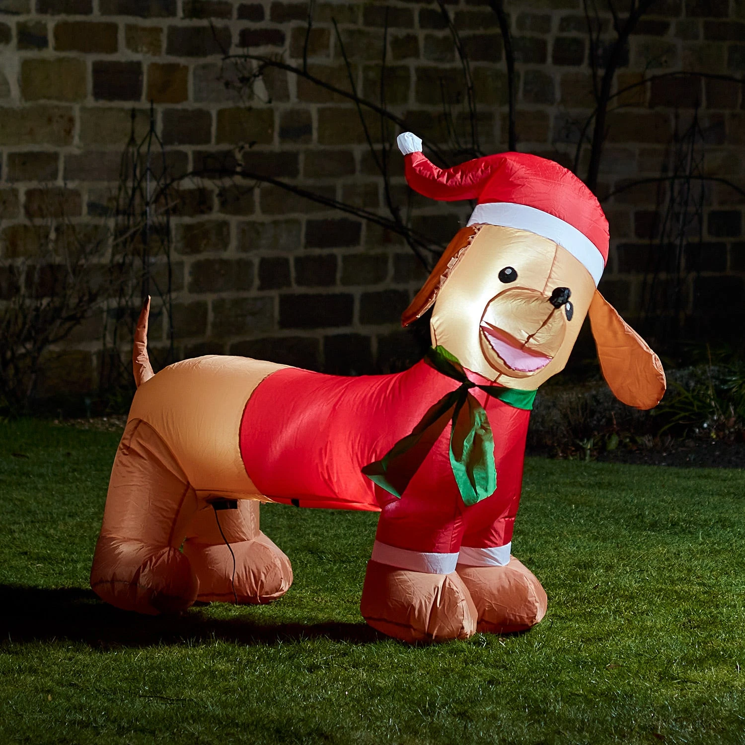 Faites sourire votre famille et vos voisins avec notre chien gonflable super mignon. Cette décoration égayera votre jardin durant les longues nuits d’hiver grâce à ses lumières LED intégrées. Notre chien gonflable est super économe en énergie et reste froid au toucher. Livré avec des crochets de sol en métal et une cordelette pour le maintenir en place, il est résistant aux intempéries et paré pour l’hiver. Avec un câble d’alimentation de 5 mètres, il n’a pas besoin d’être positionné juste à côté d’une prise de courant. Branchez-le simplement et regardez-le se gonfler en quelques instants ! Il se dégonfle aussi très facilement et se range dans une petite boîte très pratique pour les Noëls à venir.