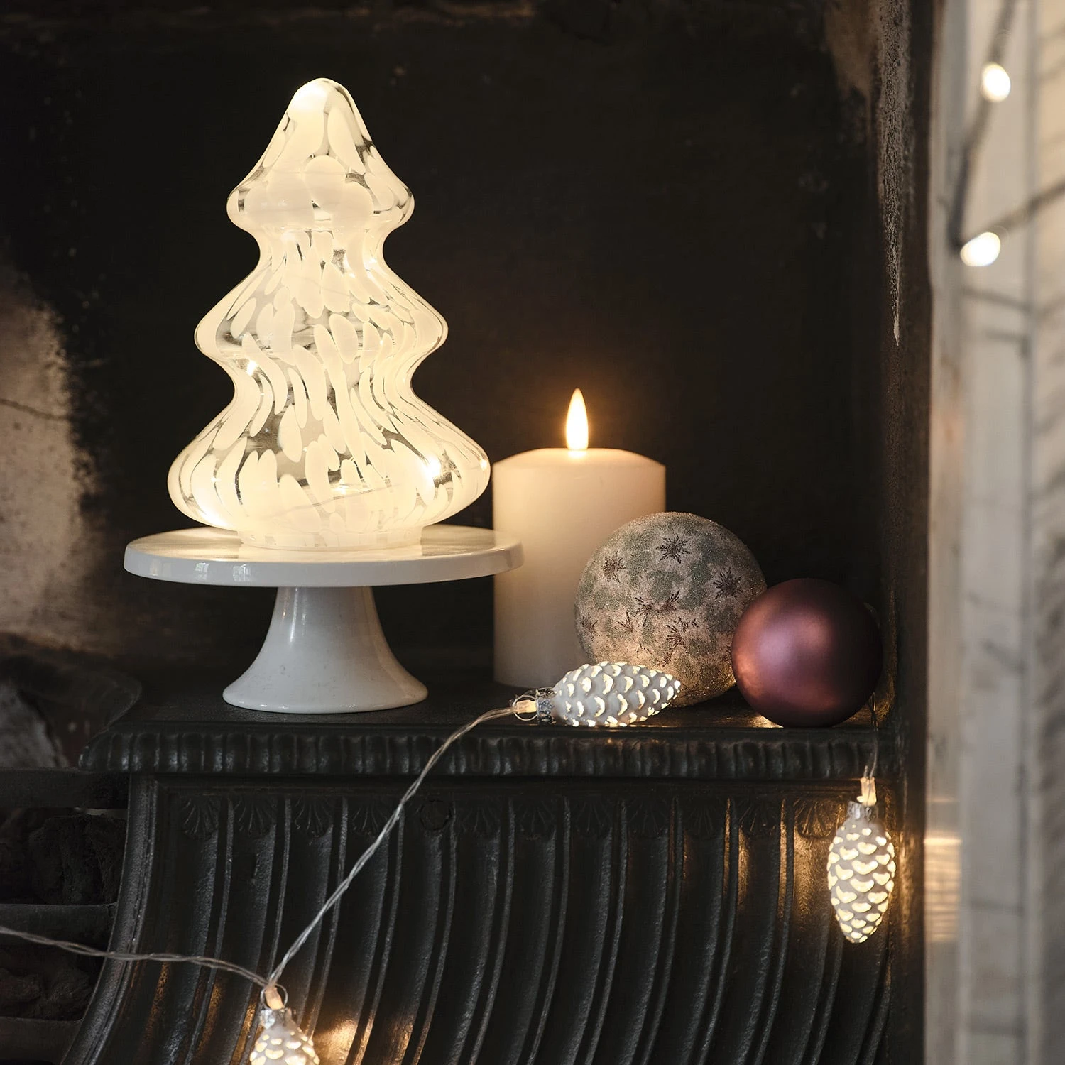 Célébrez la magie de l’hiver en ajoutant cette guirlande lumineuse composée de 10 pommes de pin en verre à LED à votre sapin de Noël. Chaque pomme de pin, espacée de 15 cm le long d’un câble transparent, présente une finition effet neigeux et argenté, éclairée de l’intérieur par une LED blanc chaud pour un éclat cosy et chaleureux. Disposez-les sur votre sapin pour créer l’illusion de pommes de pin naturelles sur les branches, ou placez-les dans un vase en verre pour une touche élégante sur une table basse.