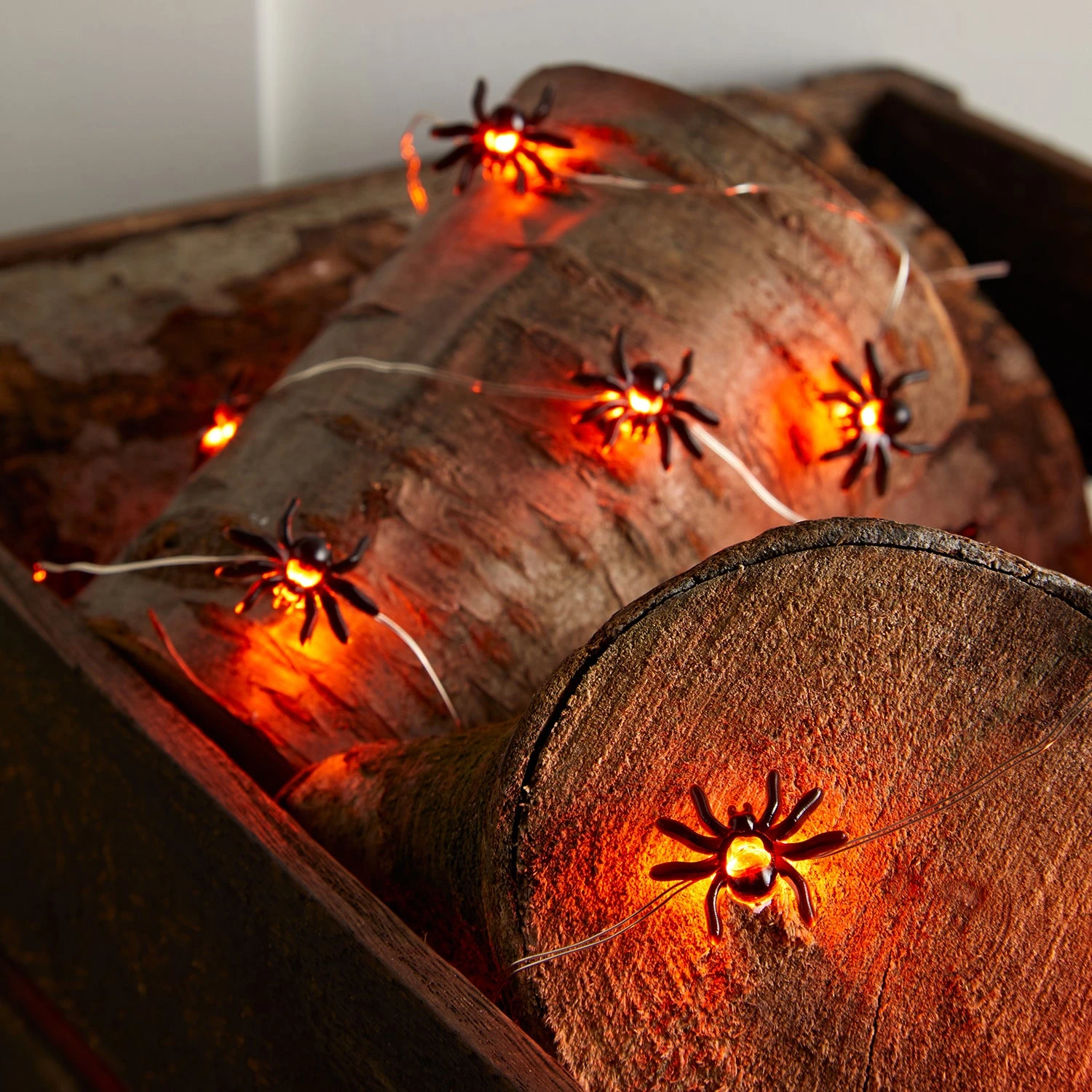 Âmes sensibles s’abstenir ! Vingt araignées, éclairées par des LED orange vif, semblent grimper sur cette guirlande de 2 m de long. || Parfait accessoire pour compléter une déco d’Halloween, ces araignées lumineuses feront le plus d’effet entrelacées autour d’autres objets déco et réussiront à en effrayer plus d’un. Le câble étant souple, vous pouvez le tordre et le positionner dans la forme que vous voulez. Insérez trois piles AA dans le boîtier, paramétrez la minuterie facultative de 6 h pour qu’elles s’illuminent tous les soirs.