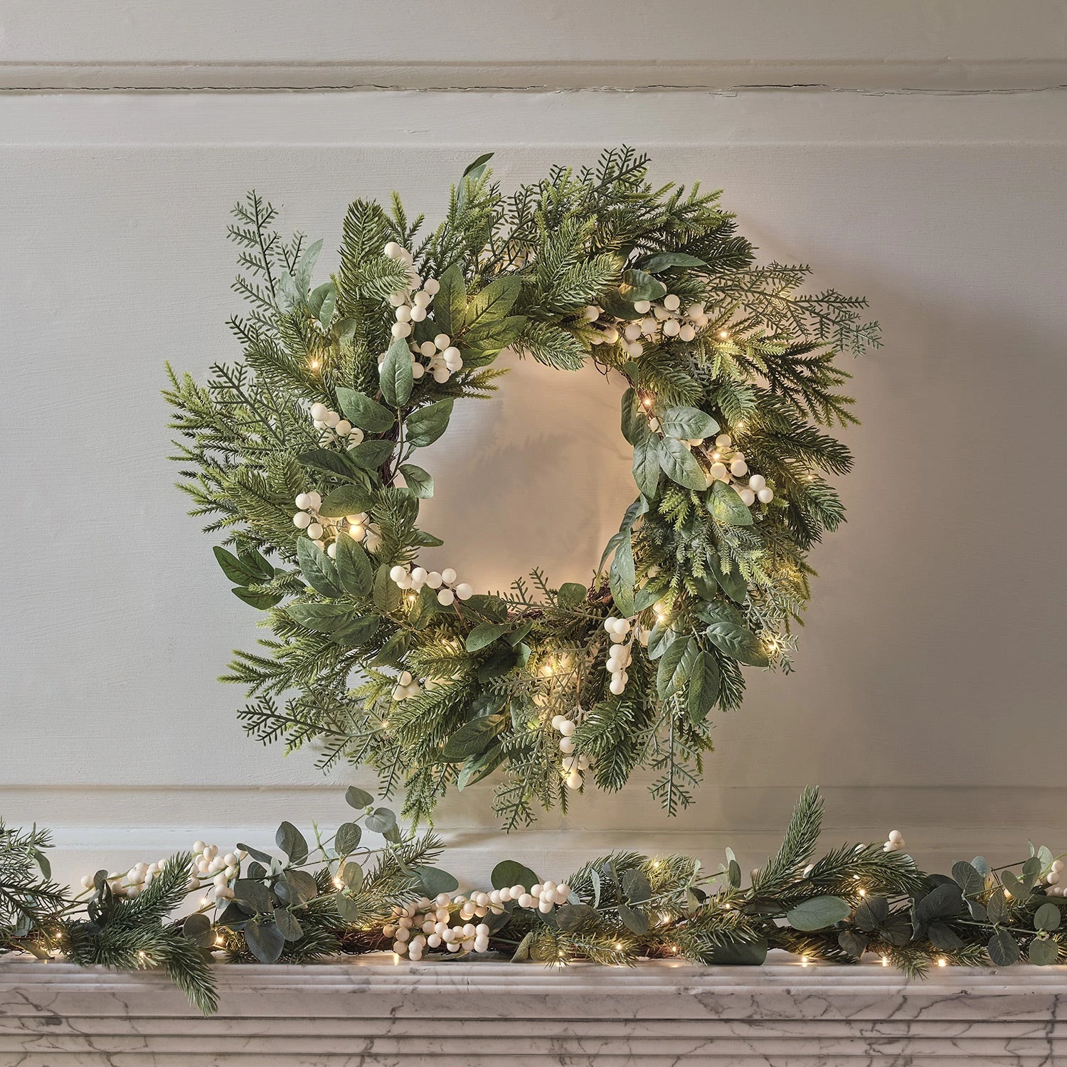 Apportez une touche d’élégance hivernale à votre intérieur avec ce lot de couronne et guirlande pré-éclairées en eucalyptus et baies blanches. La couronne repose sur une base en brindilles naturelles et associe un feuillage hivernal artificiel soigné à de petites grappes de baies blanches, pour un rendu chic et raffiné. La guirlande, longue de 1,5 mètre, complète harmonieusement la décoration avec son feuillage fin d’eucalyptus et ses baies blanches délicates. Parfaites pour décorer une porte protégée, une cheminée ou un centre de table, elles créent une ambiance festive et raffinée, idéale pour les fêtes de fin d’année.