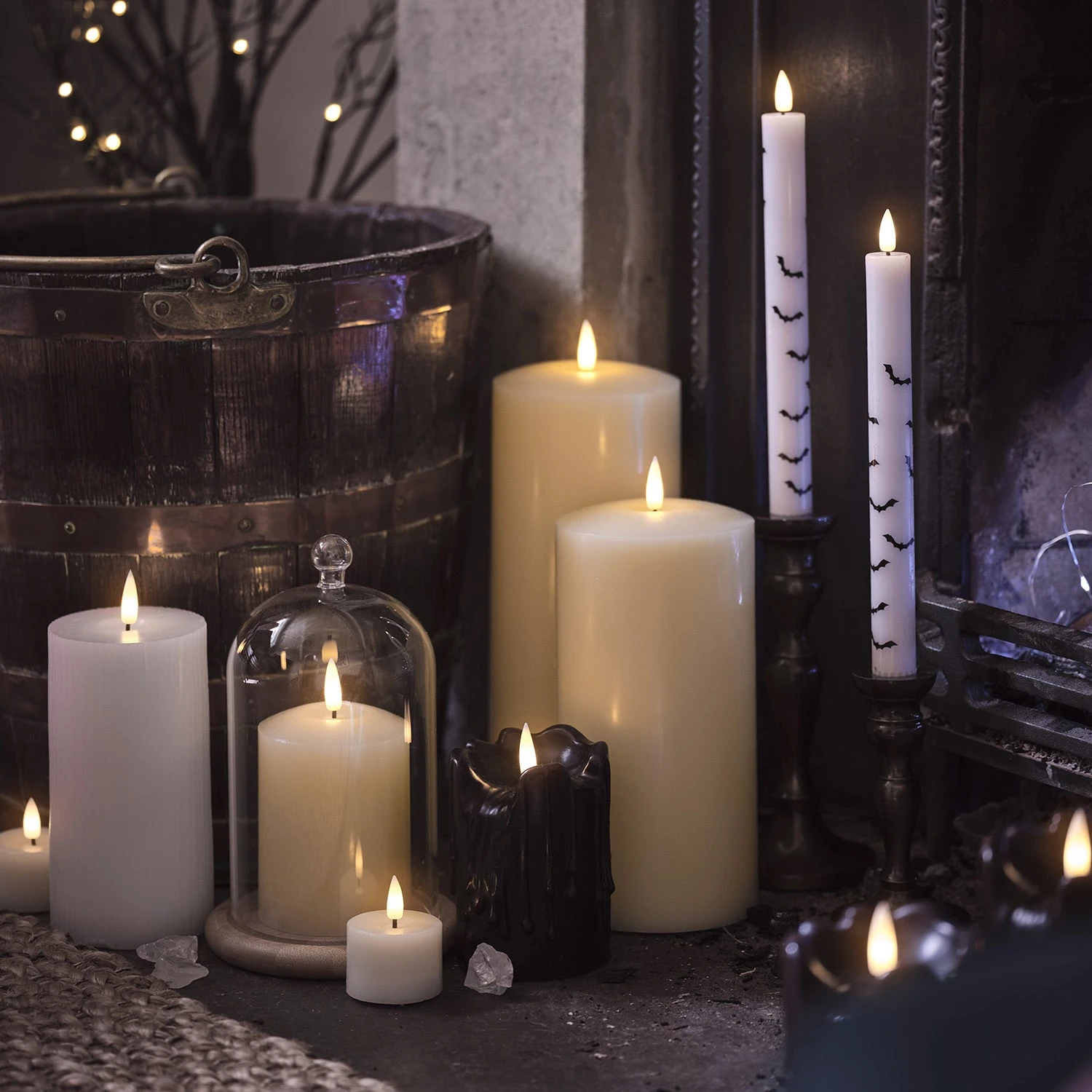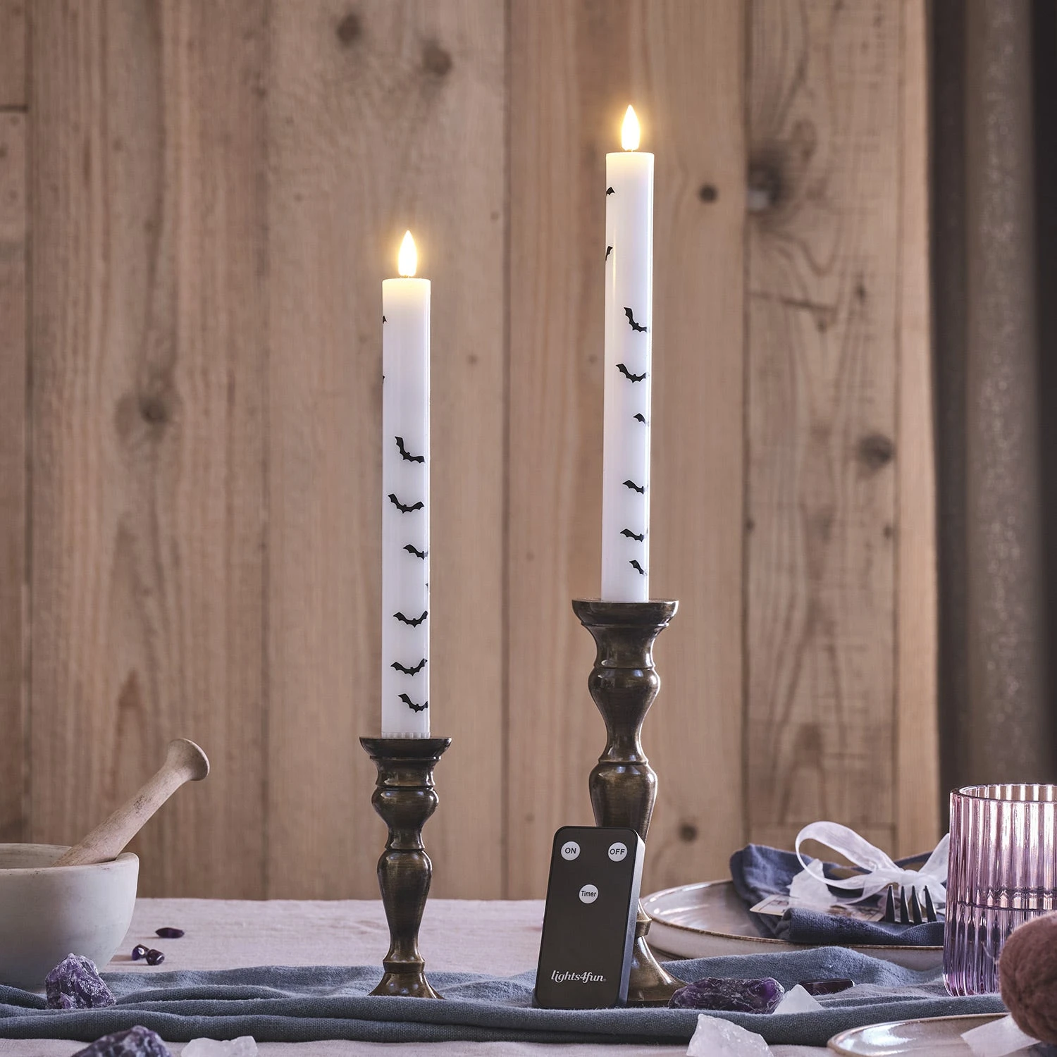Plongez votre intérieur dans l’ambiance ensorcelante d’Halloween avec nos 2 chandelles TruGlow® à motif chauve-souris. Idéales comme centre de table ou décoration de table d’appoint, ces chandelles mesurant 22 cm sont dotées de flammes vacillantes très réalistes, ajoutant une touche d’élégance lugubre à vos soirées et célébrations. Pour les utiliser, il suffit d’insérer 2 piles AAA dans chaque bougie.