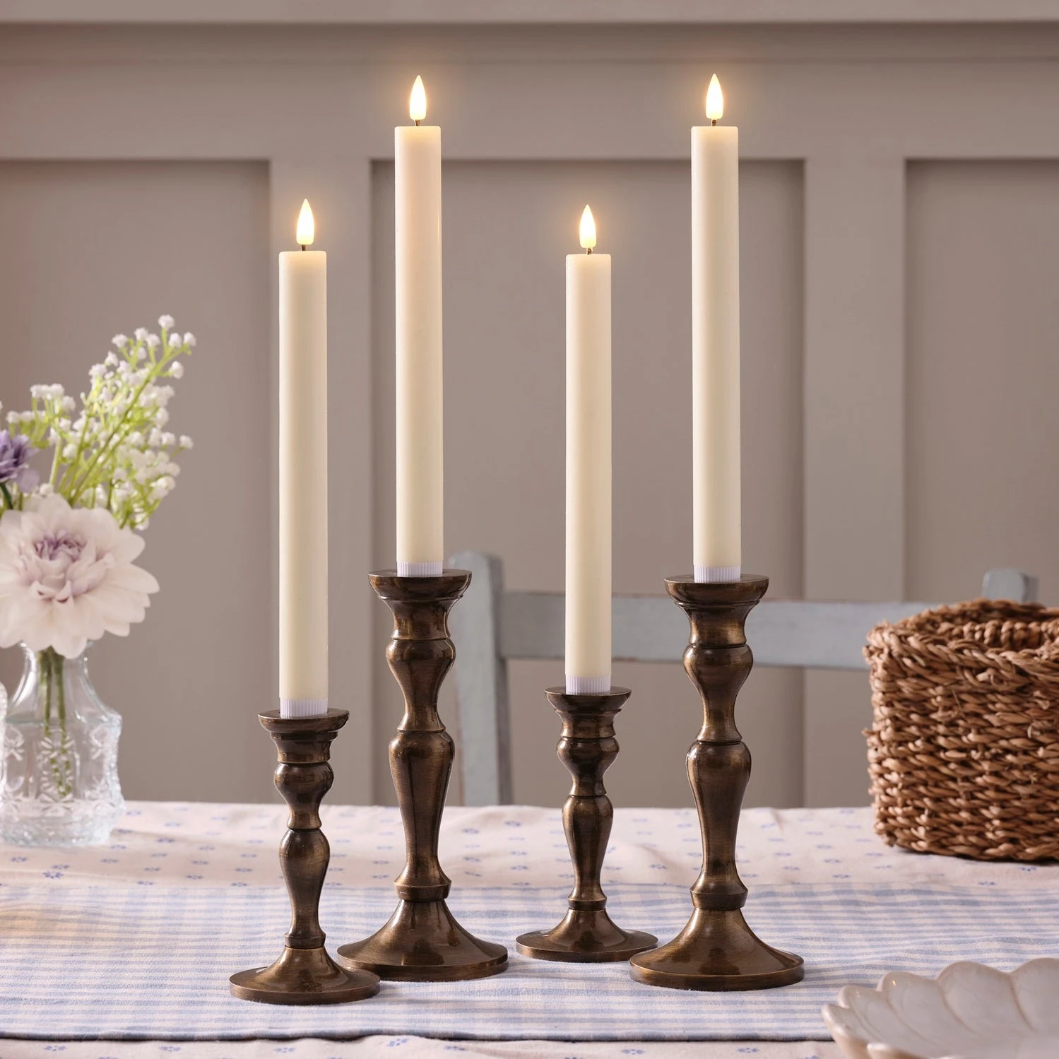 Ce lot de 4 chandelles rechargeables TruGlow® allie practicalité et durabilité pour apporter une ambiance chaleureuse à votre intérieur. Chaque bougie, fabriquée en cire véritable ivoire, mesure 25 cm de hauteur pour 2 cm de diamètre et dispose d’une flamme LED vacillante qui imite à la perfection la lueur d’une bougie traditionnelle. Grâce à leur batterie rechargeable, il suffit de placer les chandelles dans leur station de recharge pour profiter d’environ 100 heures d’éclairage après seulement 6 heures de charge. Ce lot est idéal pour être disposé sur un manteau de cheminée ou sur un rebord de fenêtre, accompagné de quelques fleurs printanières. Assurez-vous que les chandelles sont bien chargées en les plaçant dans la station de recharge, le témoin lumineux sera rouge pendant la charge et vert lorsqu’elles seront prêtes. Utilisez la télécommande incluse pour allumer et éteindre les bougies facilement ou optez pour la minuterie de 6 heures pour une lueur automatique chaque soir. Veuillez noter que la station de recharge doit être utilisée avec le câble USB fourni, ainsi qu’une prise standard de 1 amp/5 volts ou 2 amp/5 volts.
