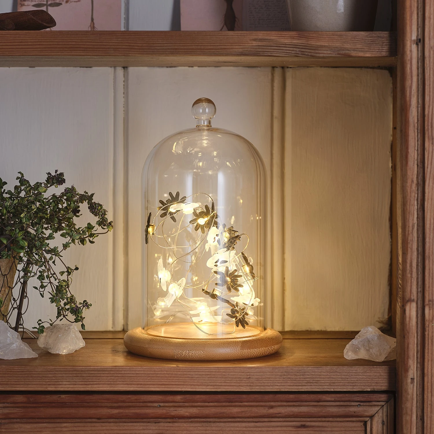 Créez une ambiance à la fois ludique et effrayante avec ce lot composé d’une cloche en verre montée sur un socle en bambou, accompagnée d’une guirlande micro-LED fantômes et araignées. Parfaite pour créer un cabinet de curiosités ou une scène d’autel mystérieuse, la cloche en verre repose sur un socle en bambou doté d’une encoche discrète pour faire passer le câble de la guirlande.