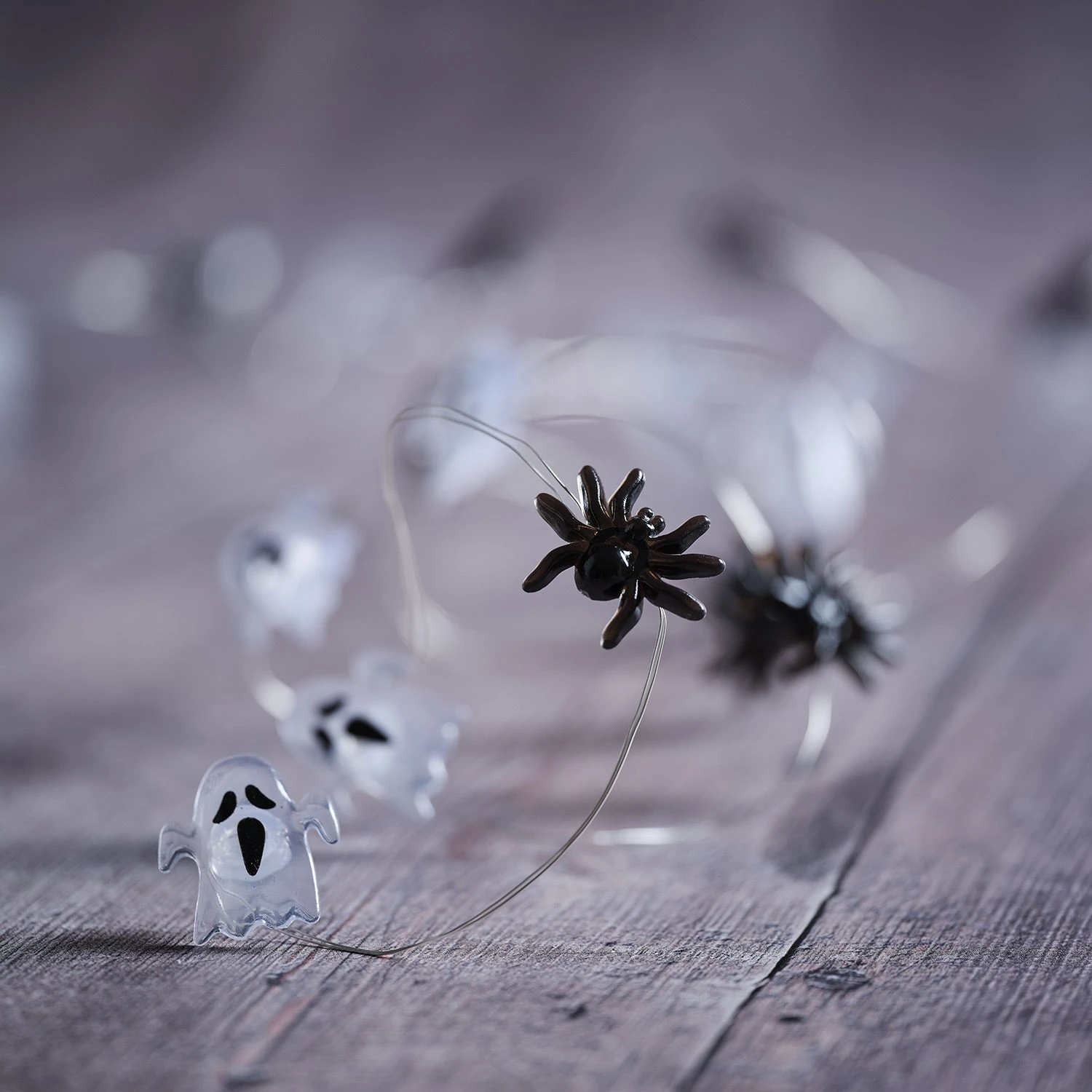 La guirlande de 1,9 m alterne 10 petits fantômes et 10 araignées, chacun illuminé par une LED blanc froid qui ajoute une touche spectrale à votre déco.
