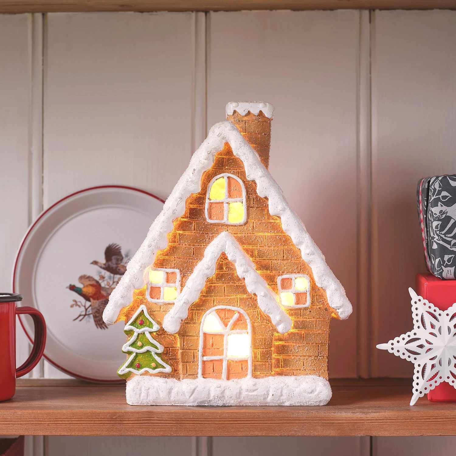 Ajoutez une note rétro et festive à votre décoration avec cette maison lumineuse en pain d’épices, idéale pour recréer l’ambiance chaleureuse des Noëls d’antan. Réalisée en céramique avec un soin particulier du détail, elle s’éclaire de l’intérieur grâce à des LED blanc chaud qui illuminent ses fenêtres enneigées et sa cheminée gourmande. Un véritable concentré de magie et de douceur !