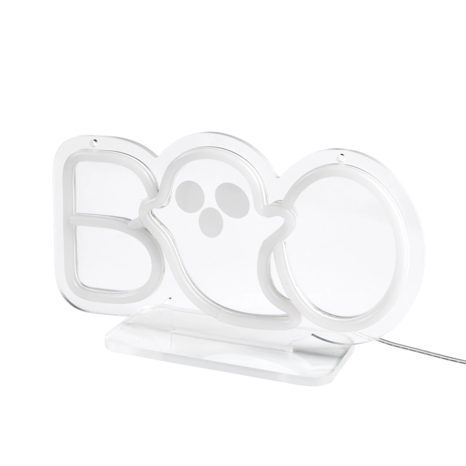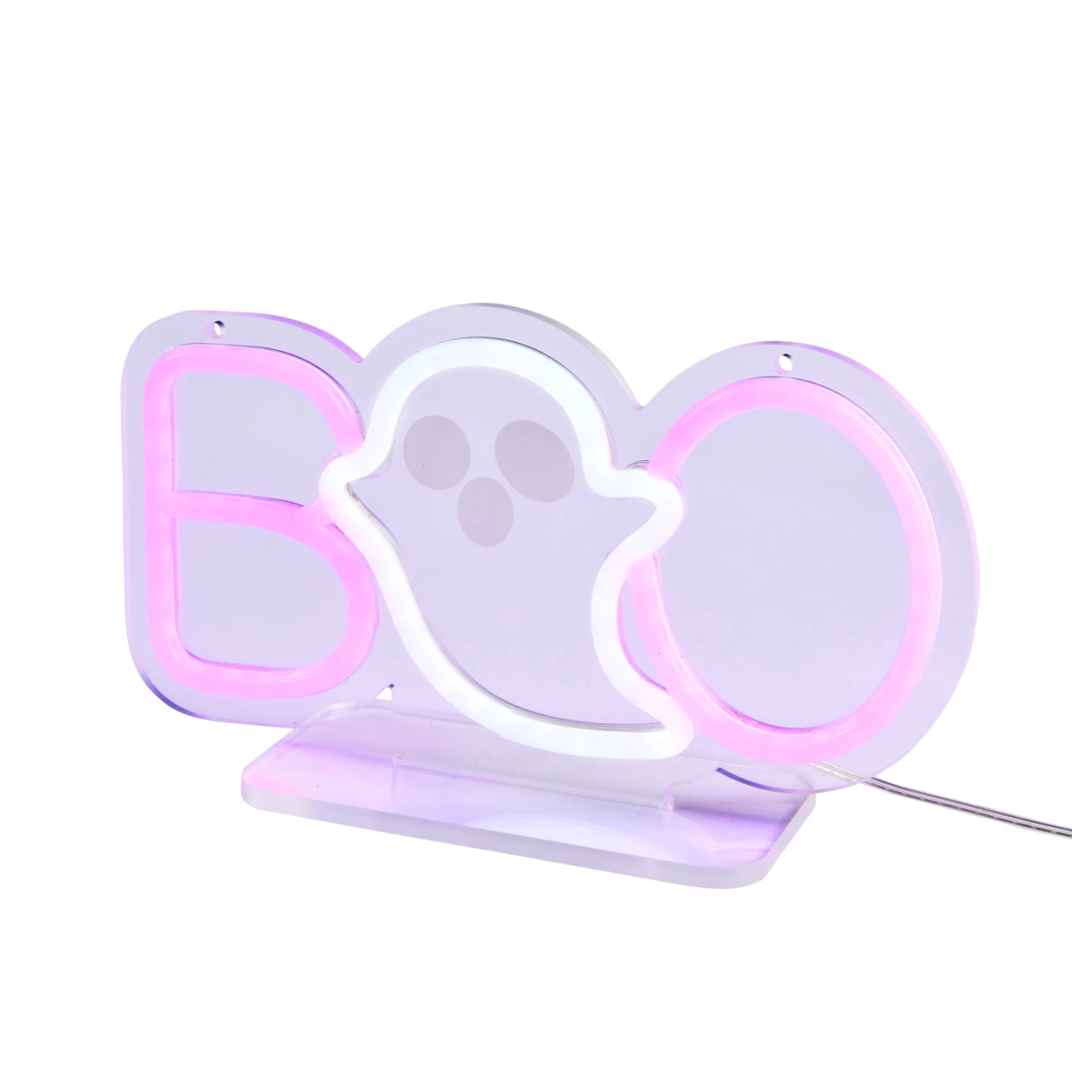Apportez une touche lumineuse et décontractée à votre déco d’Halloween avec notre enseigne néon « BOO ». Son design moderne et ludique, en néon flexible violet et blanc monté sur une structure en acrylique de qualité, s’intègre facilement à toutes les ambiances festives.